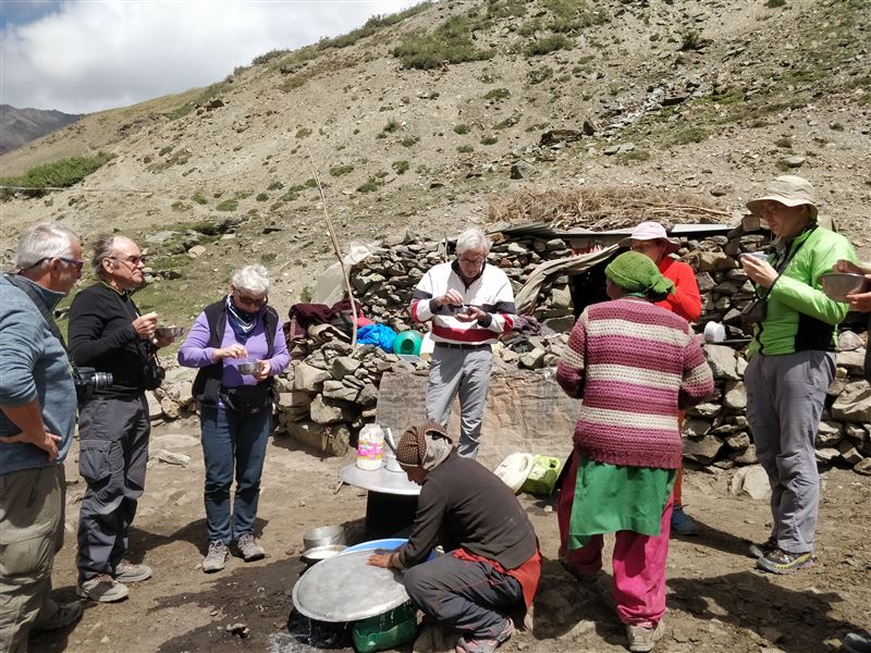 Whilst camping, the staff will bring a hot drink (usually tea) to your tent each morning. When you reach camp in the afternoon tea and biscuits will be served. At breakfast, dinner and in the afternoons, there is a choice of hot drinks. Breakfasts typically include cereal, toast and jam, eggs and porridge. Lunch on trek is usually served as a picnic en route (except on shorter days when it is in camp). Lunch and dinner typically include soup to start, followed by a variety of hot dishes (both local and western) such as potatoes/chips, vegetables, curry, pasta, rice, dal and paneer (cottage cheese). At dinner time a dessert such as tinned fruit and custard, fritters or cake is also be served.
